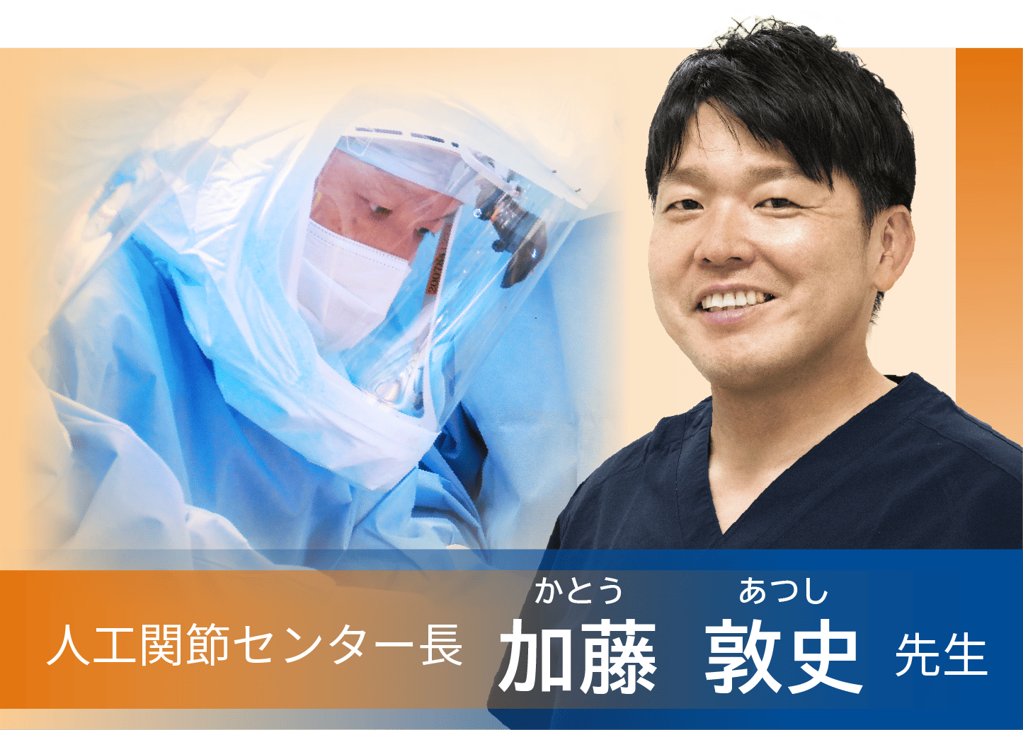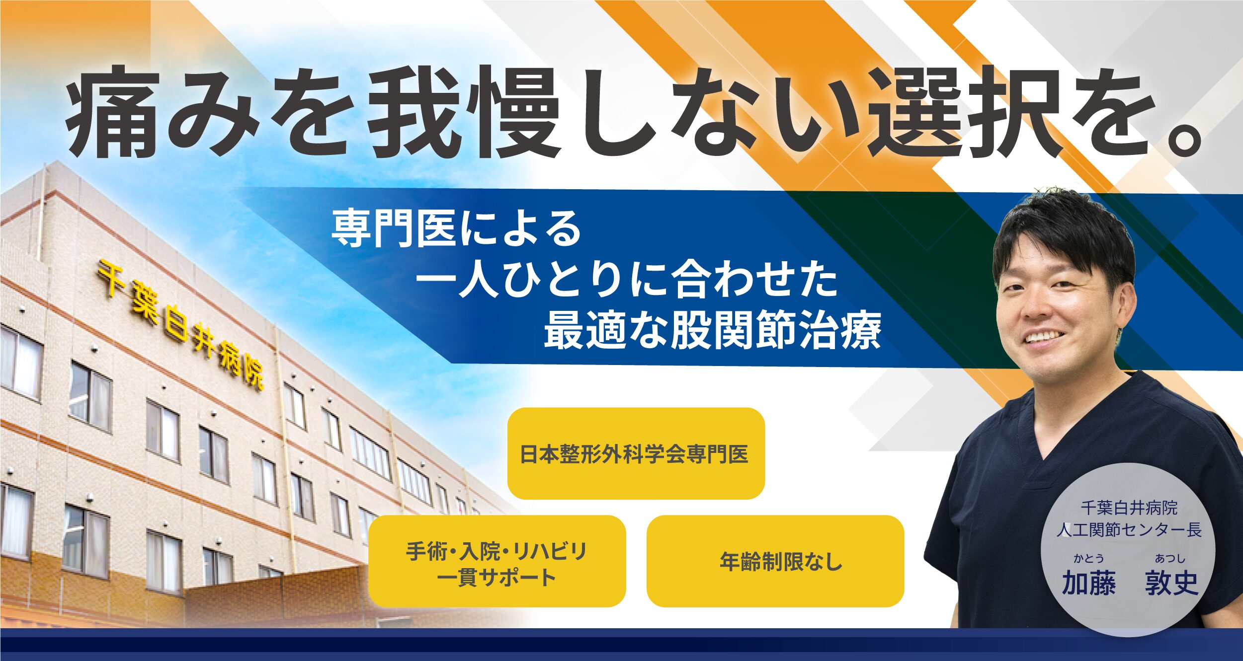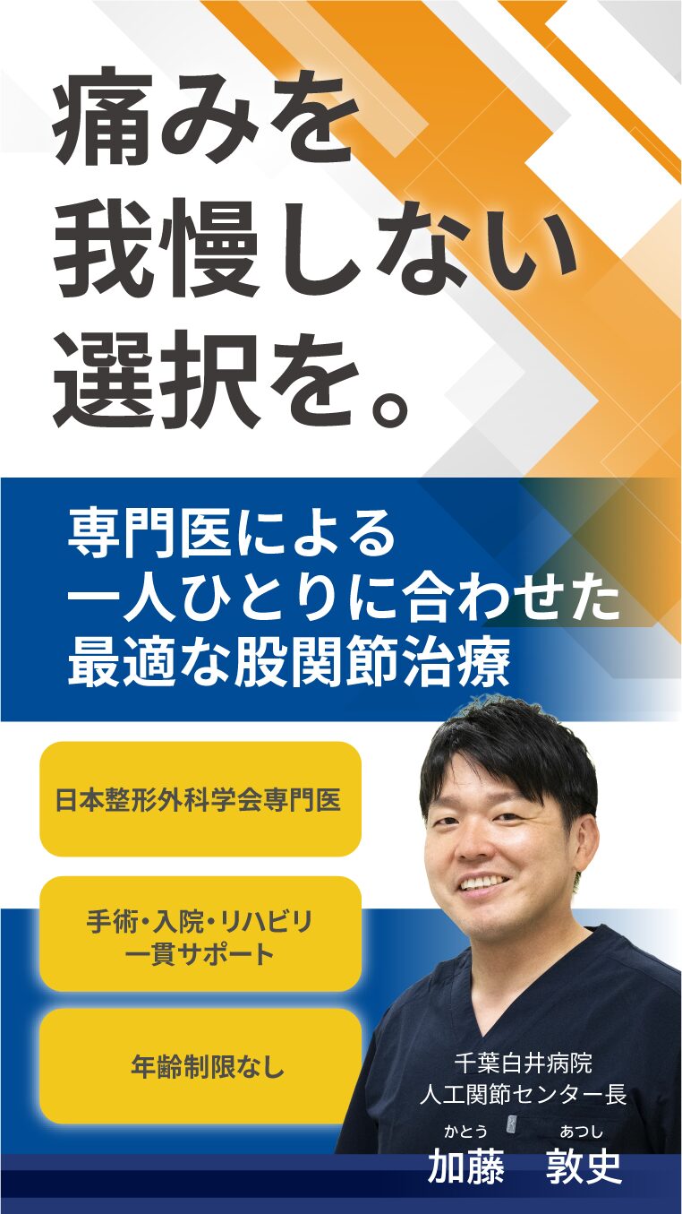 千葉白井病院人工関節センター長の加藤敦史と申します。股関節と膝関節の治療を専門に診療しております。「関節の痛みで思うように動けない」「やりたいことをあきらめている」──そのようなお悩みを抱えていらっしゃいませんか。