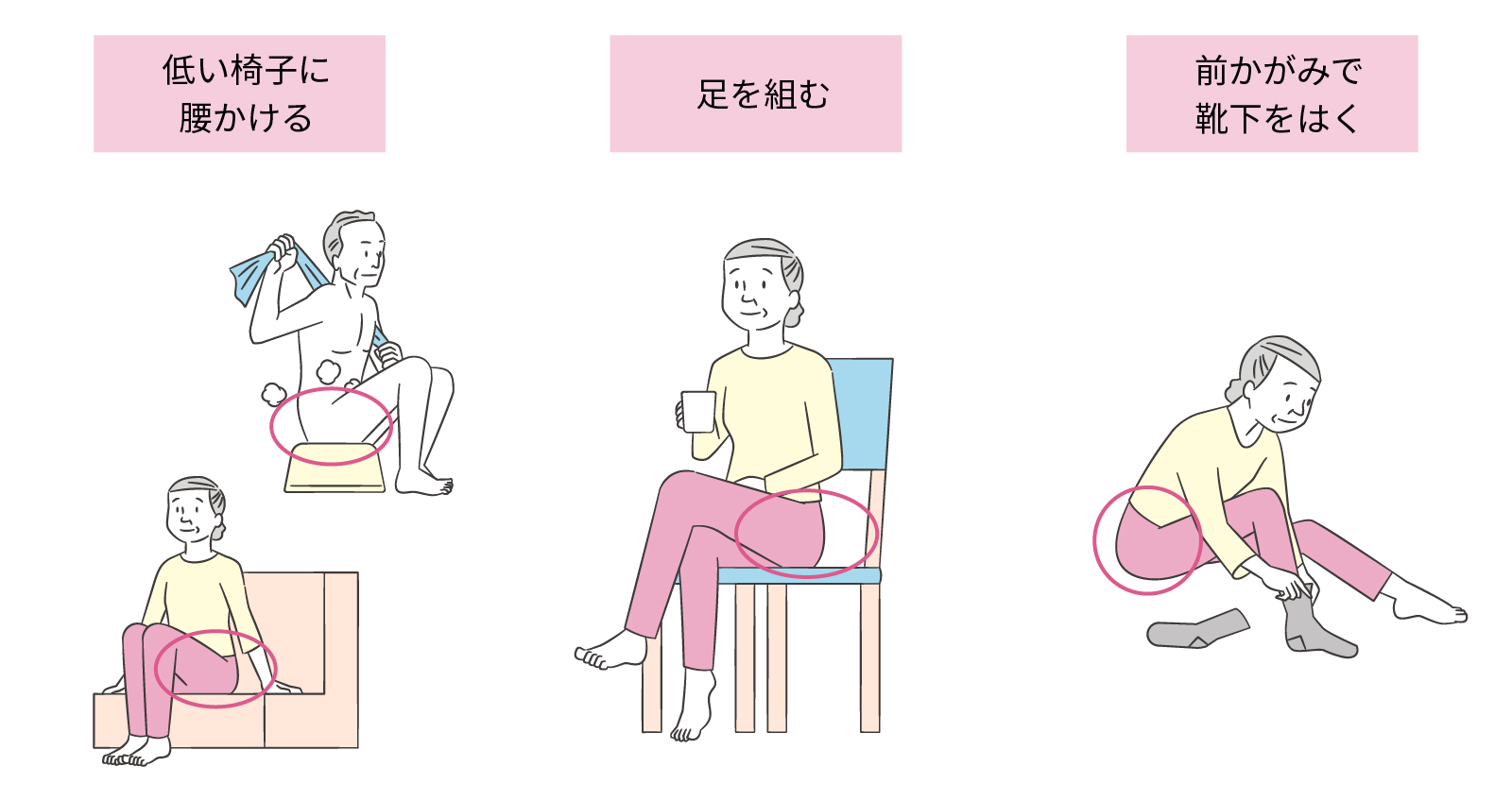 正座やあぐらで座る、足を組むなどは股関節に負担をかけやすいので股関節の疾患がある人は避けましょう。