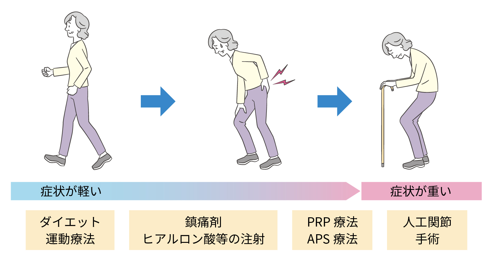 具体的には、体重コントロールなどをはじめとする生活習慣の改善や運動療法、ヒアルロン酸注射や投薬による痛みのコントロールなどで症状の軽減を目指します。
