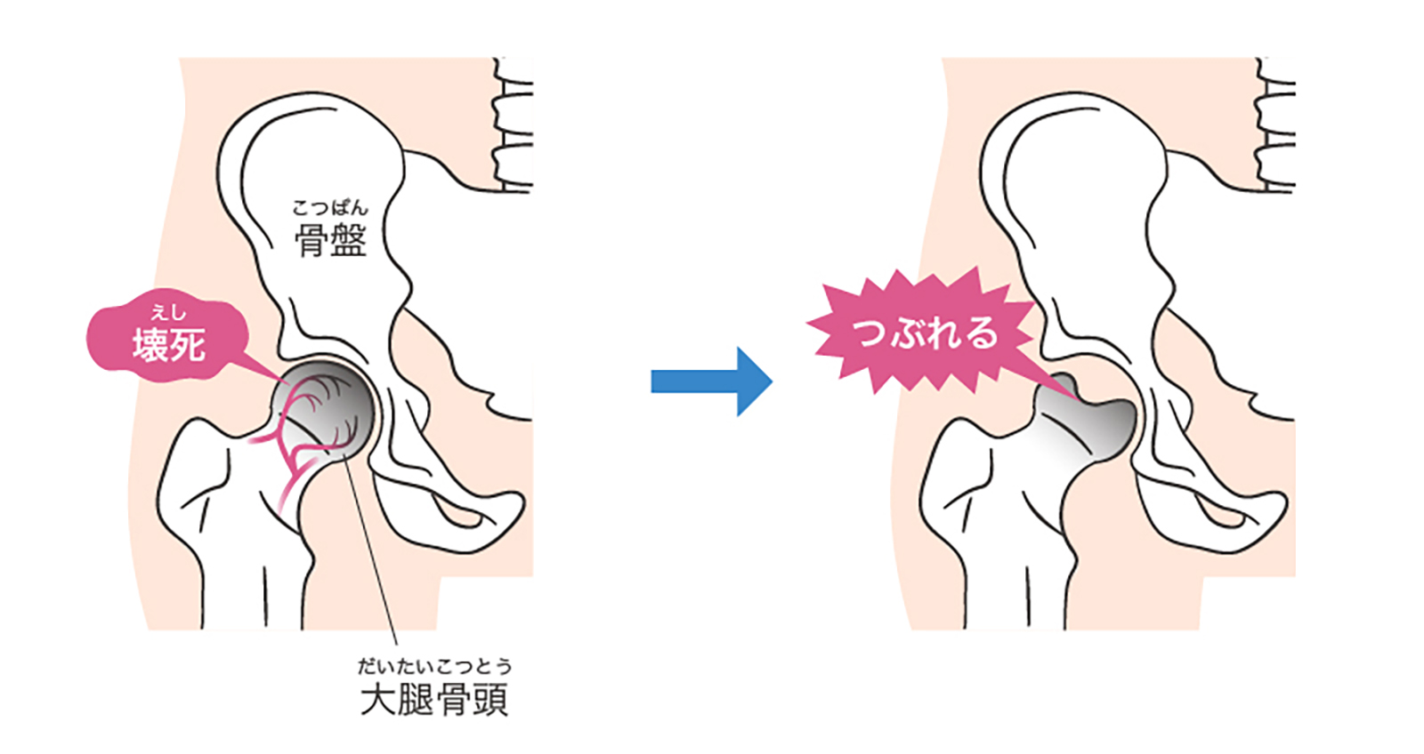 明らかな原因がないにも関わらず、大腿骨頭への血流が途絶えて壊死(細胞が死んでしまうこと)に陥る疾患。